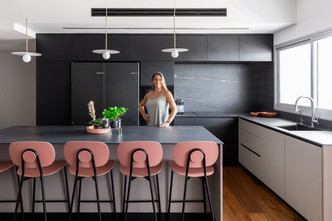 מתאהבים ממבט ראשון כן, ככה זה קורה כשמתכוננים להיכנס לדירת קבלן סטנדרטית ופתאום מגלים קן מגורים מעוצב בהתאמה מושלמת למשפחה שגרה בו. את פני הבאים מקבל ארון שעוצב בגוונים של שחור ועץ טבעי ומולו, מטבח חדש, מאובזר ופרקטי שלגווניו האפורים הותאמו כיסאות גבוהים בגוון וורוד רגוע ומרגיע. איך אפשר שלא להתחיל ולהתאהב? הכיסאות הוורודים מוסיפים נקודת צבע עדינה לעיצוב המטבח וארון הכניסה בהם בולטים גווני שחור אפור ועץ במרקם מחוספס מיוחד ומודרני עיצוב פנים: ענבר לוריא צילום: הודיה סיביל