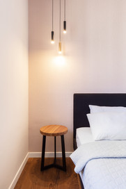 במרכזה של סוויטת הורים מפנקת הוצבה המיטה. עם תוספת של טפט בגוון ורוד בטקסטורה מחוספסת עדינה, גוון שחוזר על עצמו בשפת העיצוב שנבחרה לדירה, וקיר זכוכית בדוגמת גלינה, המפריד את אזור השינה מחדר הרחצה. השקיפות החלקית שלו מחד שומרת על האינטימיות בחדר הרחצה ומצד שני יוצרת תחושה של מרחב גדול.