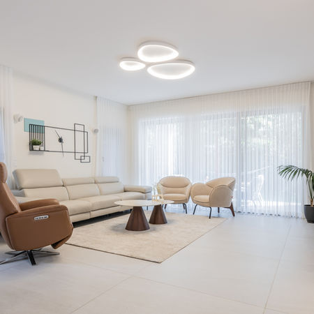 הסלון, פינת האוכל והמטבח תוכננו כמרחב זורם ומאיר, עם מינימליזם חכם שמדגיש פונקציונליות לצד אסתטיקה מודרנית.